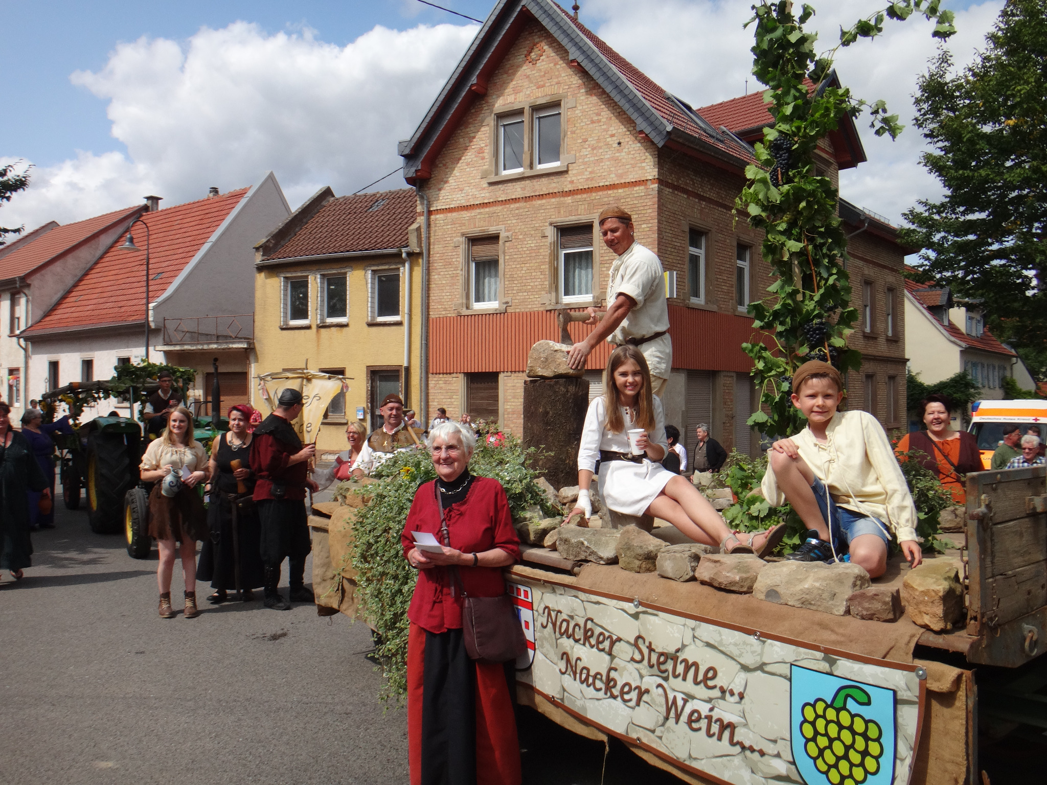 Mit zwei Wagen und einer stattlichen Fußgruppe (insgesamt 23 Teilnehmer) war man mitten drin dabei. Auf dem großen Wagen war Klaus-Dieter Illy als Steinhauer und eine hochrankende Weinrebe zu sehen, während der 2. Wagen für die Getränke genutzt wurde. Aber dieser Wagen auch auch mit Sonnenblumen und Weinranken verziert. Bei schönstem Sommerwetter und angenehmen Temperaturen machte es der Gruppe sichtlich Spaß durch die Gassen zu laufen und den Besuchern am Rand gekühlte Getränke anzubieten. Nach dem Umzug setzte man sich noch gemütlich zu einem kleinen Umtrunk auf dem Kerbeplatz zusammen. Herzlichen Dank an alle Helfer für den Aufbau des Wagen und die Dekoration. Besonders natürlich an die beiden Traktorfahrer Norbert Lahm und Fabian Illy und alle Teilnehmer am Umzug.