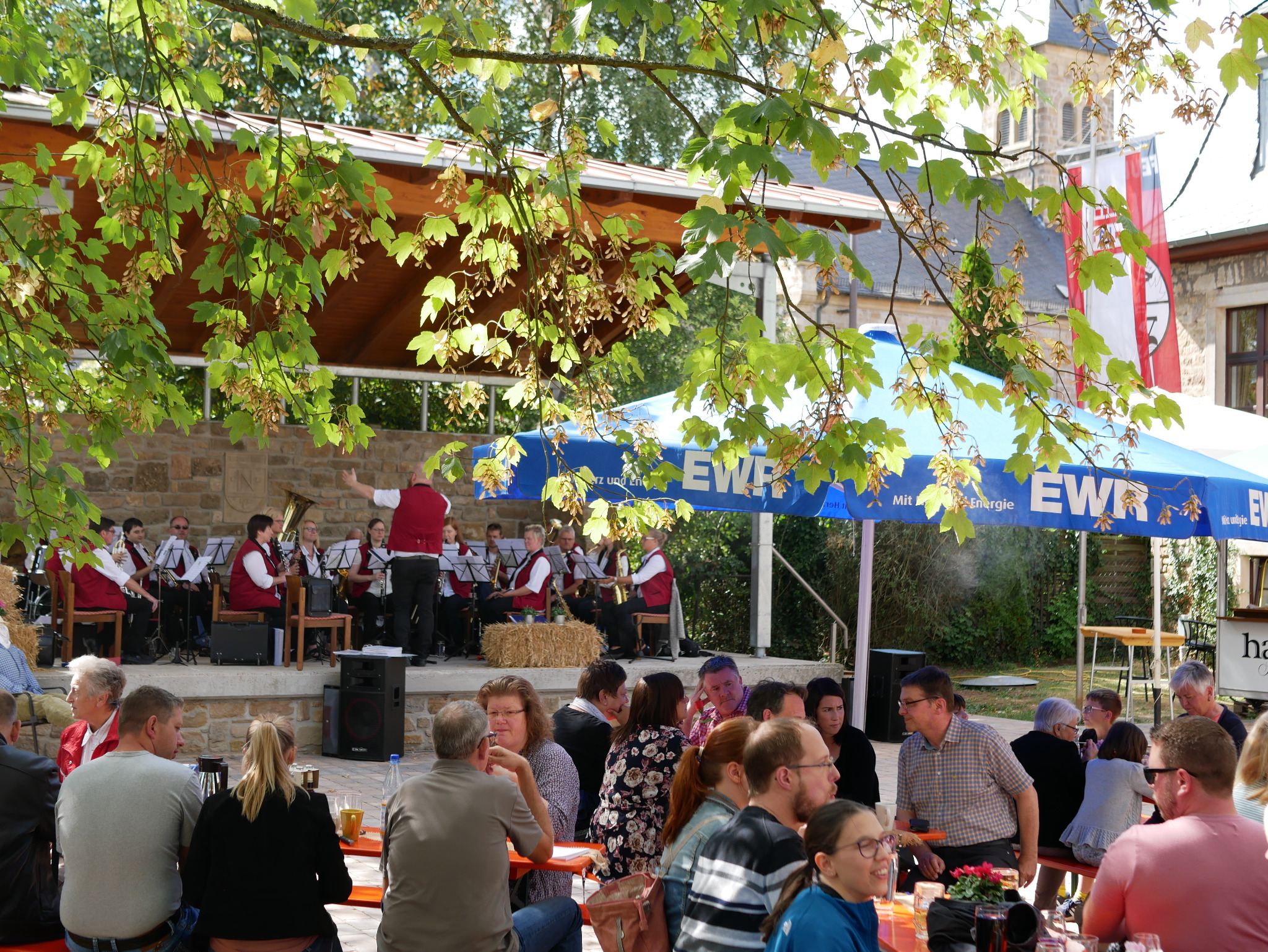 Es war wieder eine schöne Kerb in diesem Jahr. Das herrliche Sommerwetter hat sich zwar verabschiedet und uns besonders in den Abendstunden einen deutlichen Vorgeschmack auf den Herbst geliefert, aber es war doch noch recht angenehm. Auf dem Foto (Katja Stabe) ist unserer besonderer Ehrengast zu sehen: die derzeit amtierende Kartoffelkönigin von Rheinland-Pfalz, Sabrina I., hatte die Gelegenheit genutzt Ihrem neuen Wohnort die Ehre zu erweisen und die Kerb zu eröffnen. Im Hintergrund sind schon einige Feuerwehrmänner zu sehen die dann auch den Kerbebaum aufgestellt haben. Traditionell war der Kerbeauftakt am Freitag das Schlachtfest vom Sportverein. Am Samstag ist die 2. Bierprobe, organisiert und präsentiert vom Kerbeteam gut angekommen und der Open-Air-Auftritt der Gruppe "Nimm 3" war der Höhepunkt am Abend. Am Sonntagmittag war der Kirchenmusikverein Cälia Flonheim erneut zu Gast und die Musiker aus Flonheim unterhielten die Besucher mit vielen bekannten Melodien. Das Platzkonzert des Orchesters, unter Leitung des Nacker Philipp Marouelli fand großen Anklang und sie erhielten eine Menge Applaus. Bei schönem Wetter und angenehmer Musikbegleitung konnte man sich es auf dem Kerbeplatz gemütlich machen. Die Kaffee- und Kuchentheke der Landfrauen war geöffnet, es gab eine reichhaltige Speisenauswahl und natürlich auch den Getränkestand der FFw Nack. Das Kerbeteam rund um die Landjugend hatte gemeinsam mit drei Nacker Winzer einen Wein- und Sektstand betrieben und auch der Cocktailstand bot erfrischendes an. Das Kerbeteam hatte als weitere Programmpunkte eine Tombola und einen Luftballonwettbewerb organisiert, die auch von den Besuchern gerne angenommen wurden. Später übernahm Klaus-Dieter Illy das Musikprogramm bis in die Abendstunden. Für den Montag ist dann der Kerbeausgang vorgesehen. Es stehen Freifahrten auf dem Programm und leider muss dann das Kerbemaskottchen, der "Kerbenackus" wieder "beerdigt" werden. Den Abschluss wird DJ Jürgen Steinmann übernehmen. Von vielen Besuchern habe ich gehört dass es Ihnen sehr gut bei uns in Nack gefallen hat und daher möchte ich dieses Lob an allen Beteiligte weitergeben und ganz herzlich Danke sagen.