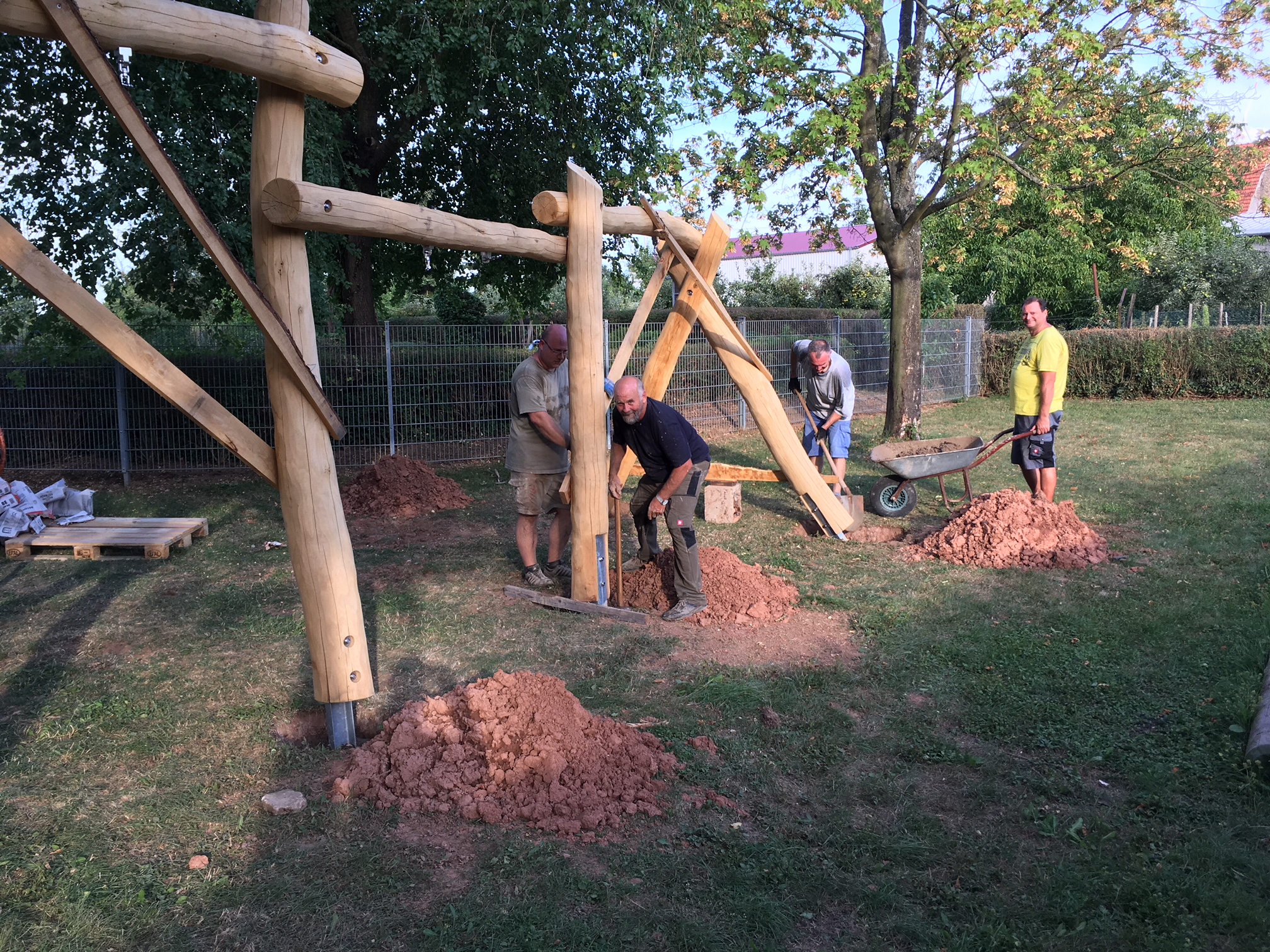 Eine neue Schaukel ist inzwischen auf dem Spielplatz hinter dem Bürgerhaus errichtet worden. Das Foto zeigt die Helfer gerade beim Einbringen des Betons für die Fundamente. Aufgrund der massiven Holzbauweise war es zwar kein leichtes Unterfangen, aber das Naturmaterial passt doch sehr gut dahin. Bei der ca. 12 Jahre alten Schaukel waren die Pfosten inzwischen morsch geworden und daher wurde jetzt die Ausführung mit Metallanker vorgenommen. Vielen Dank hier auch noch an Ralf Butty für das Entsorgen der alten Fundamentreste sowie der alten Balken.