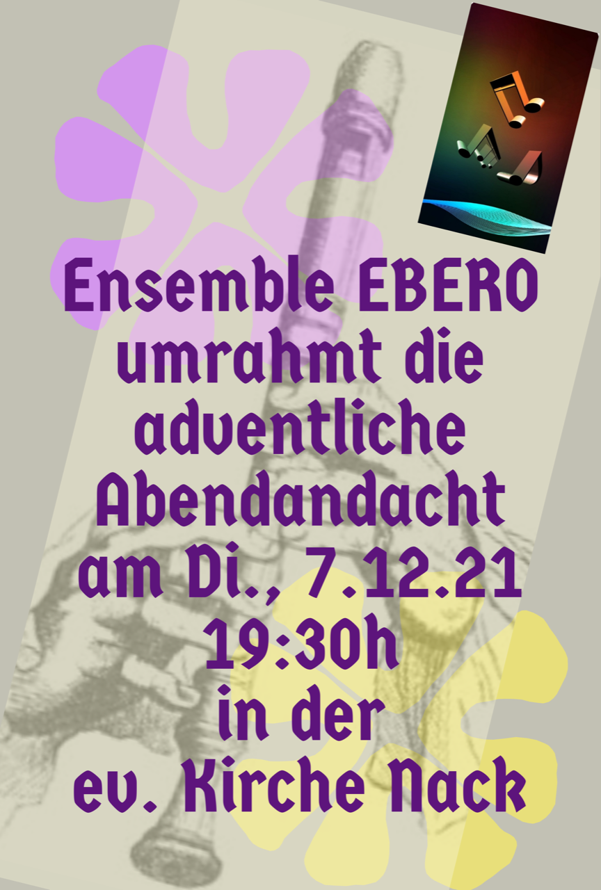 Das Blockflöten-Ensemble EBERO, welches im Sommer diesen Jahres ein sehr abwechslungsreiches Konzert in der evangelischen Kirche in Nack gespielt hat, ist mittlerweile auf zehn Mitgliederinnem (drei aus Nack) angewachsen und wird am Dienstag, den 7. Dezember, um 19:30 Uhr die adventliche Abendandacht in der evangelischen Kirche mitgestalten. Zu hören sein werden ein weihnachtliches Medley, das Halleluja aus G.F.Händels Messias sowie ausgewählte Weihnachtslieder zum Mitsingen.