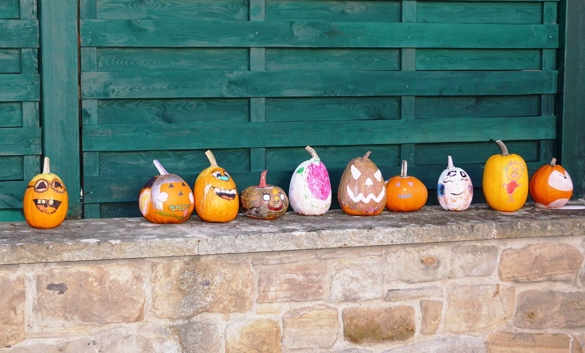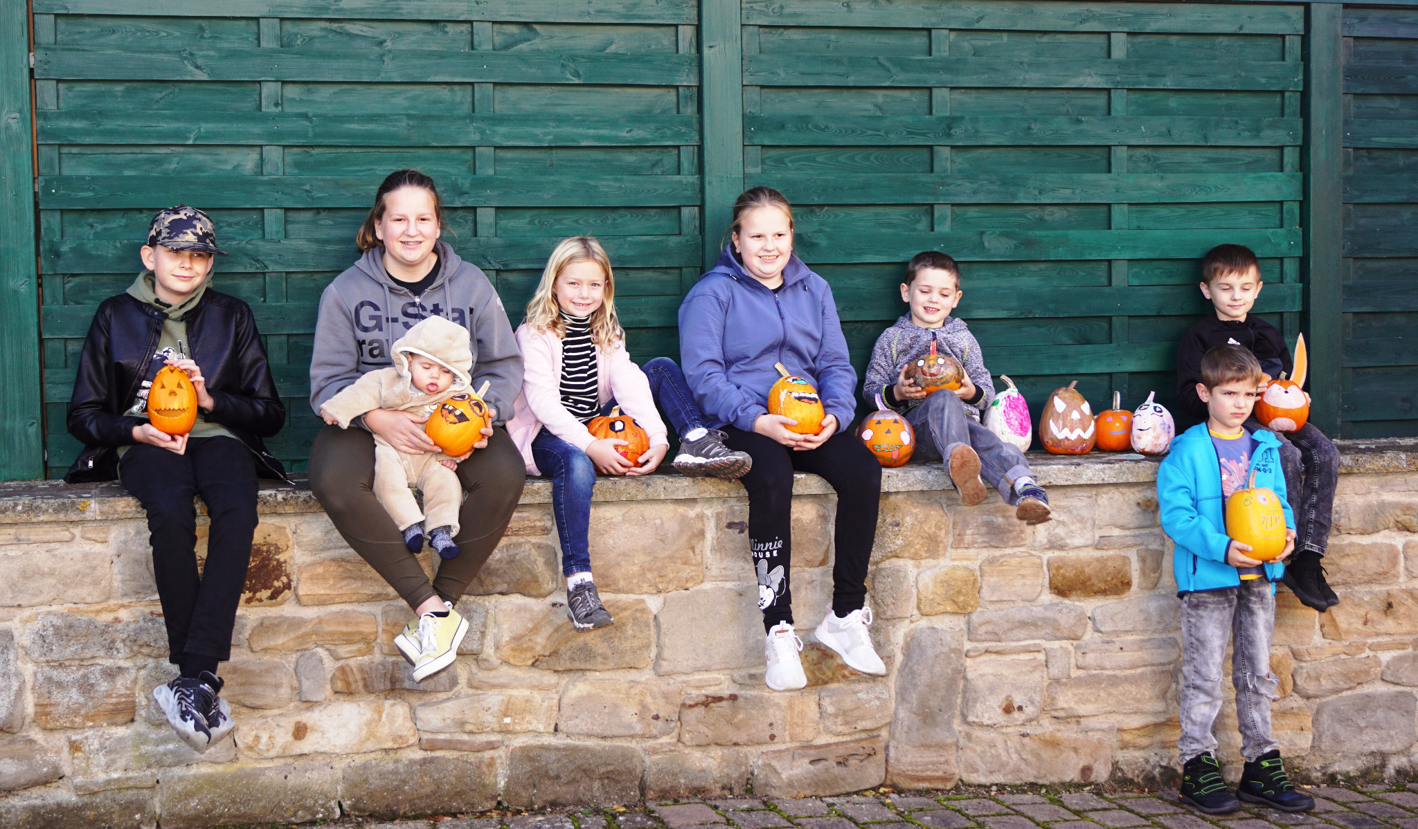 Voller Stolz präsentieren die Kinder die von ihnen bemalten Kürbisse am Bürgerhaus in Nack. Auf Initiative von Silvia Illy konnten sich die Kinder die von Max Wernersbach gespendeten Kürbisse abholen, bemalen und dekorieren. Die Kürbisse schmücken nun die Mauer am Bürgerhaus und können dort bewundert werden. Vielen Dank an Silvia Illy und Max Wernersbach.